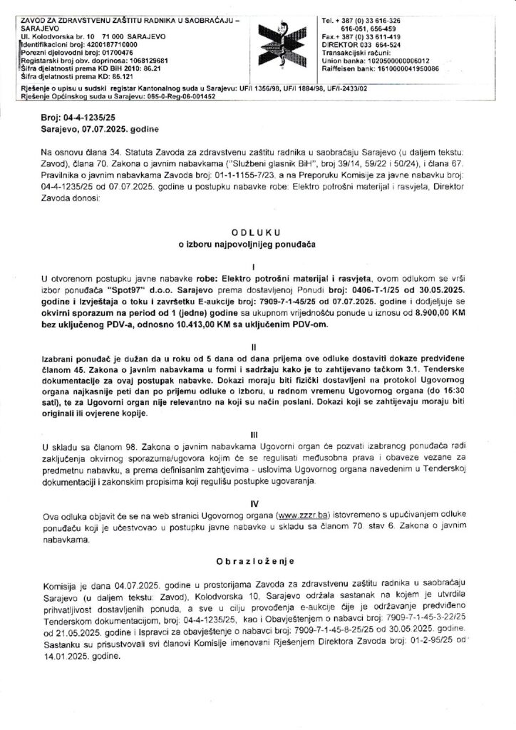 Odluka o izboru – Elektro potrošni materijal i rasvjeta