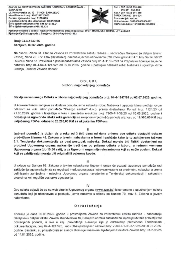 Odluka o izboru III – nabavka i ugradnja klima uređaja