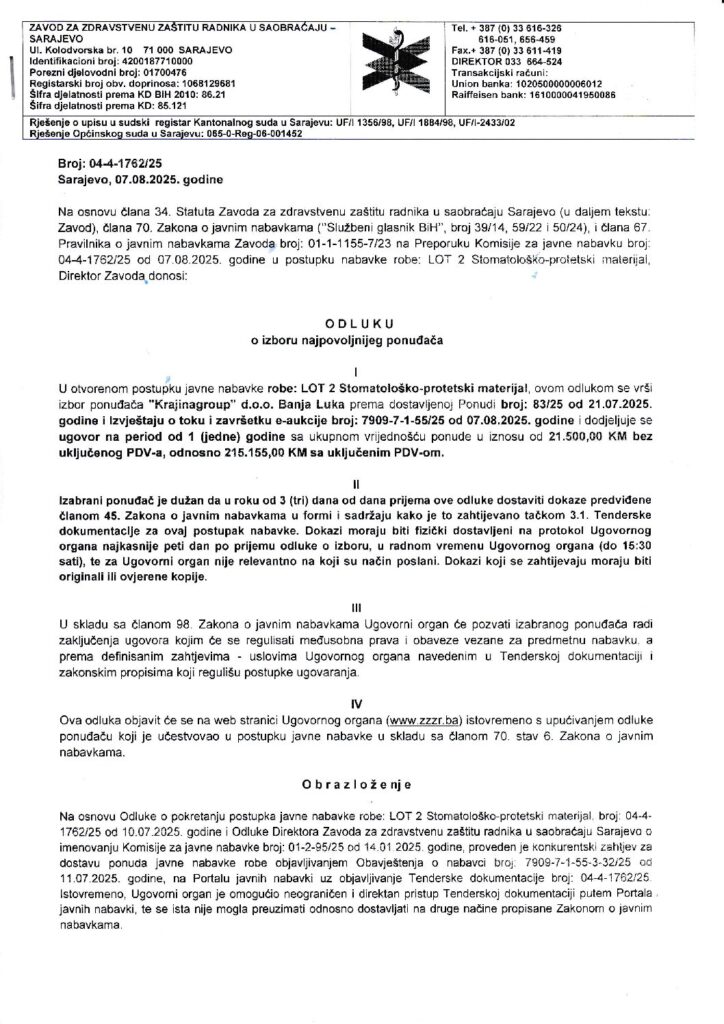 Odluka o izboru – LOT 2 Stomatološko-protetski materijal-1
