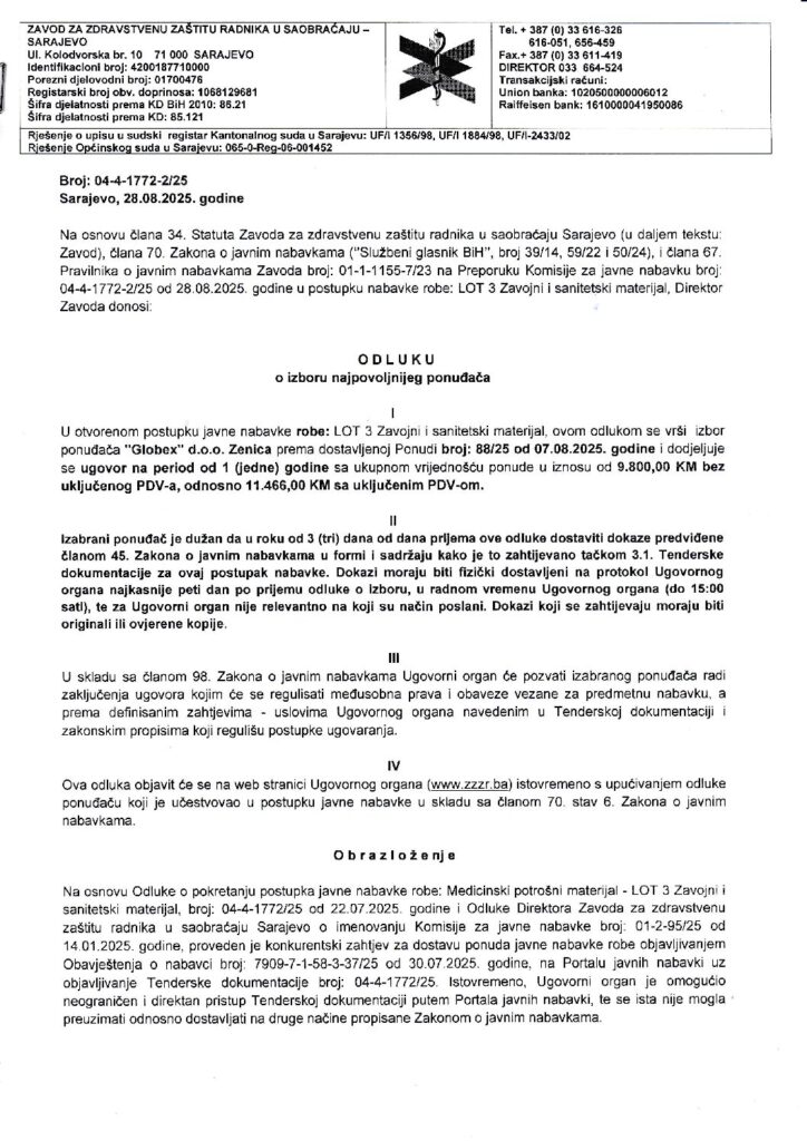 Odluka o izboru – LOT 3 Zavojni i sanitetski materijal-1