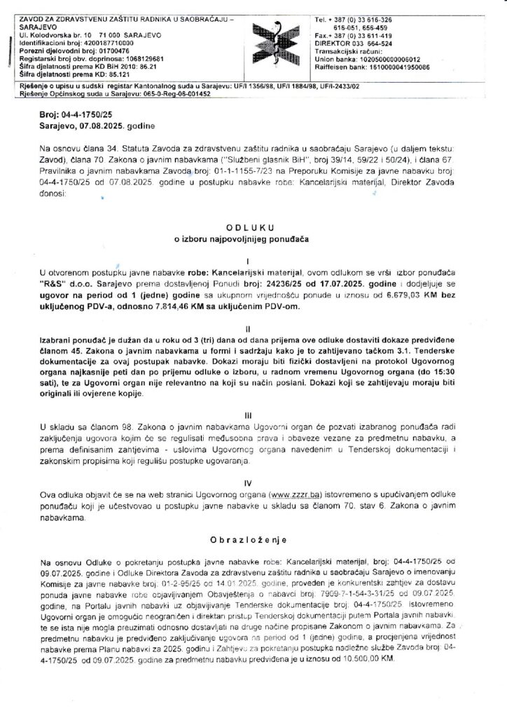 Odluka o izboru – kancelarijski materijal