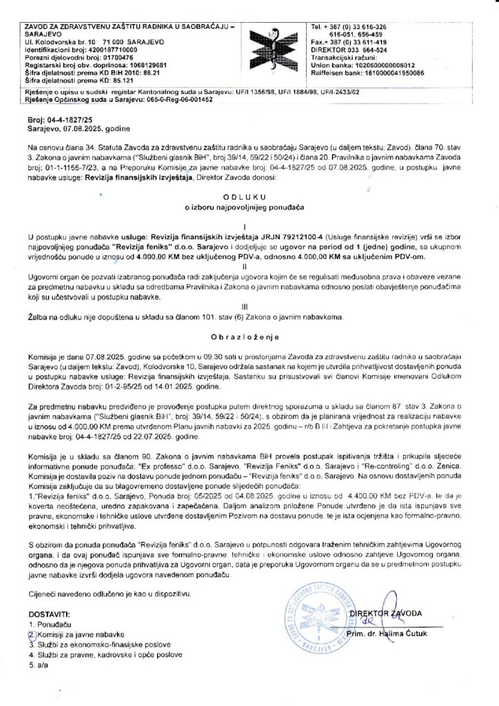 Odluka o izboru – revizija finansijskih izvještaja