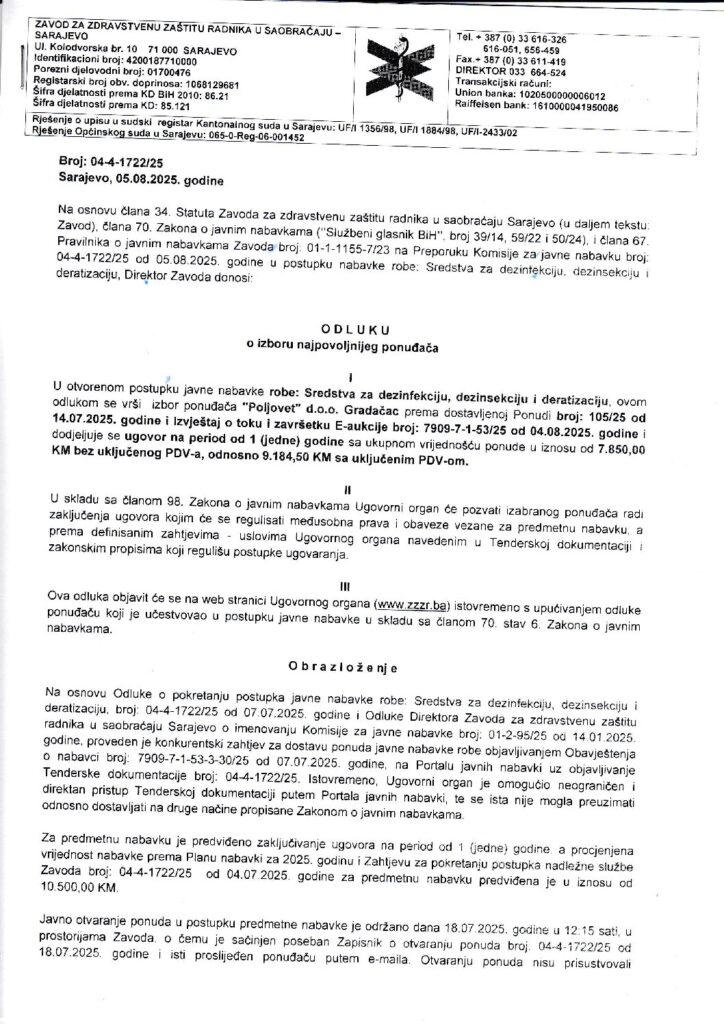 Odluka o izboru – sredstva za dezinfekciju, dezinsekciju i deratizaciju-1