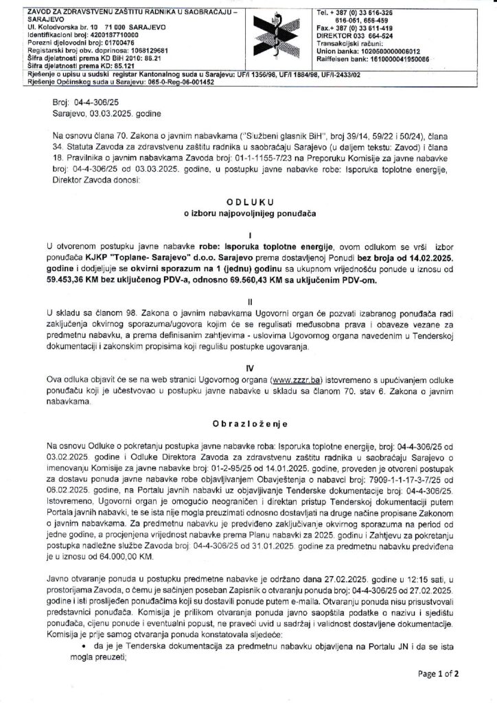 Odluka o izboru – isporuka toplotne energije