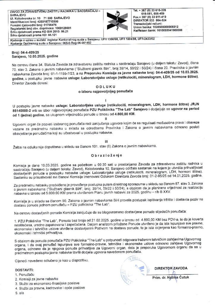 Odluka o izboru – laboratorijske usluge (retikulociti, mineralogram, LDH, hormoni štitne)