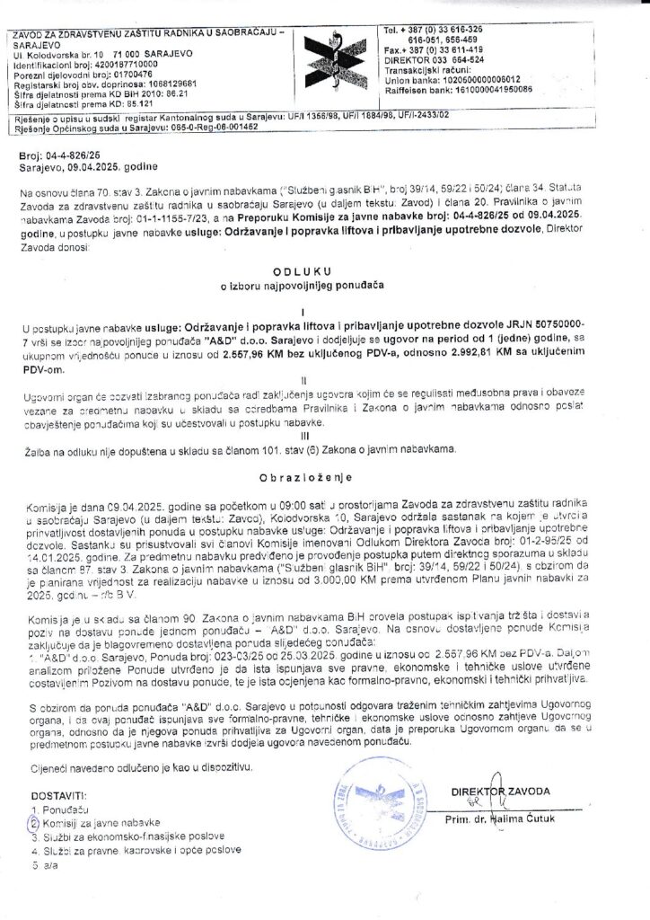 Odluka o izboru – održavanje i popravka liftova i pribavljanje upotrebne dozvole