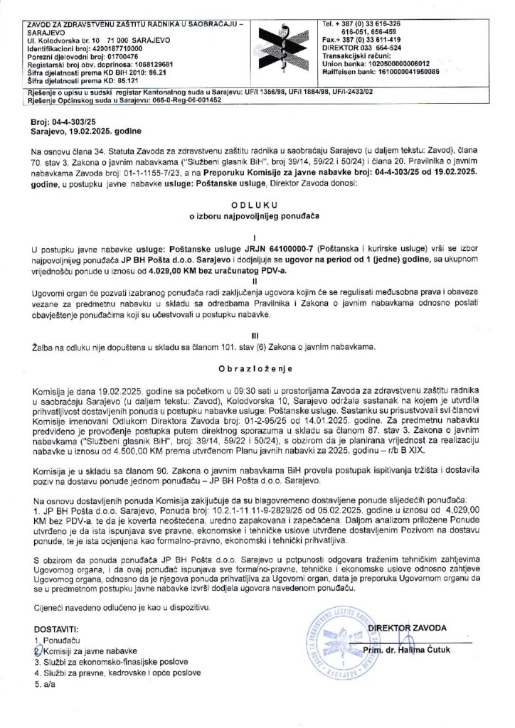 Odluka o izboru – poštanke usluge