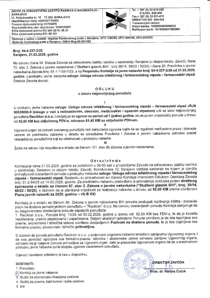 Odluka o izboru – usluga odvoza infektivnog i farmaceutskog otpada – farmaceutski otpad