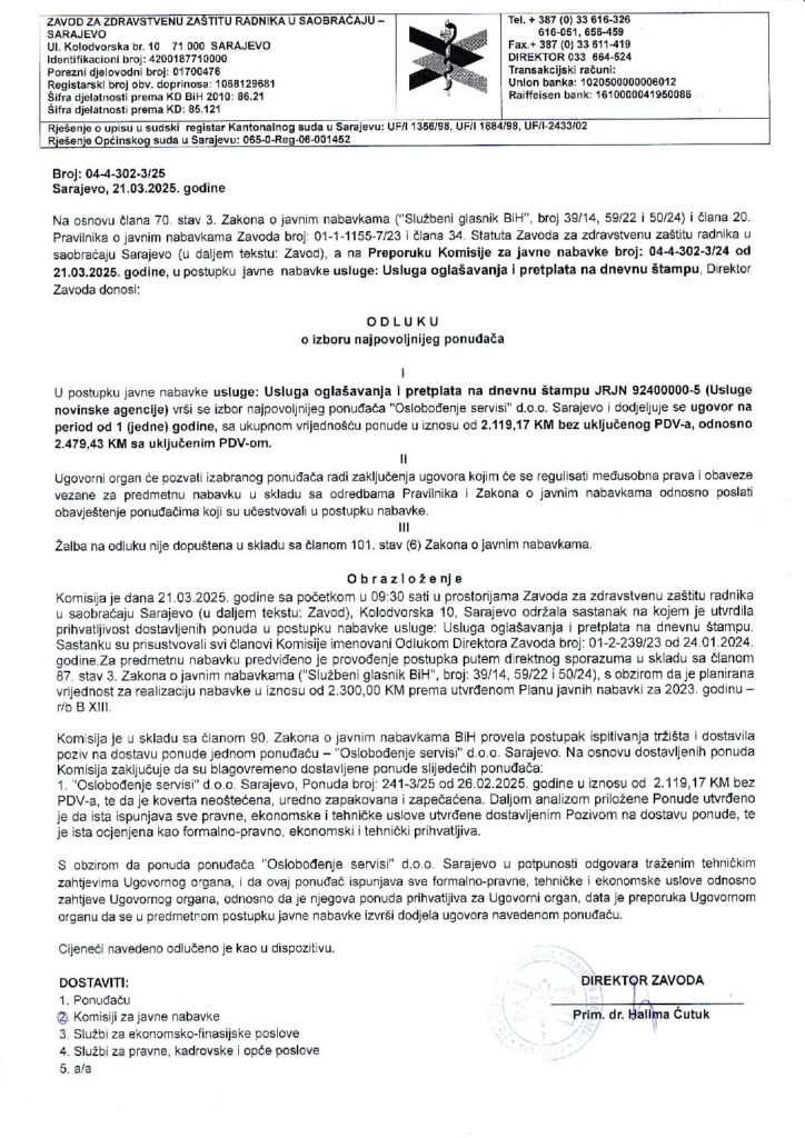 Odluka o izboru – usluga oglašaanja i pretplata na dnevnu štampu