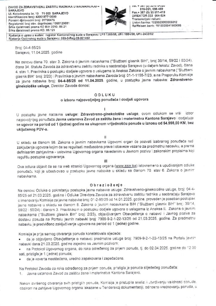 Odluka o izboru – zdravstveno – ginekološke usluge