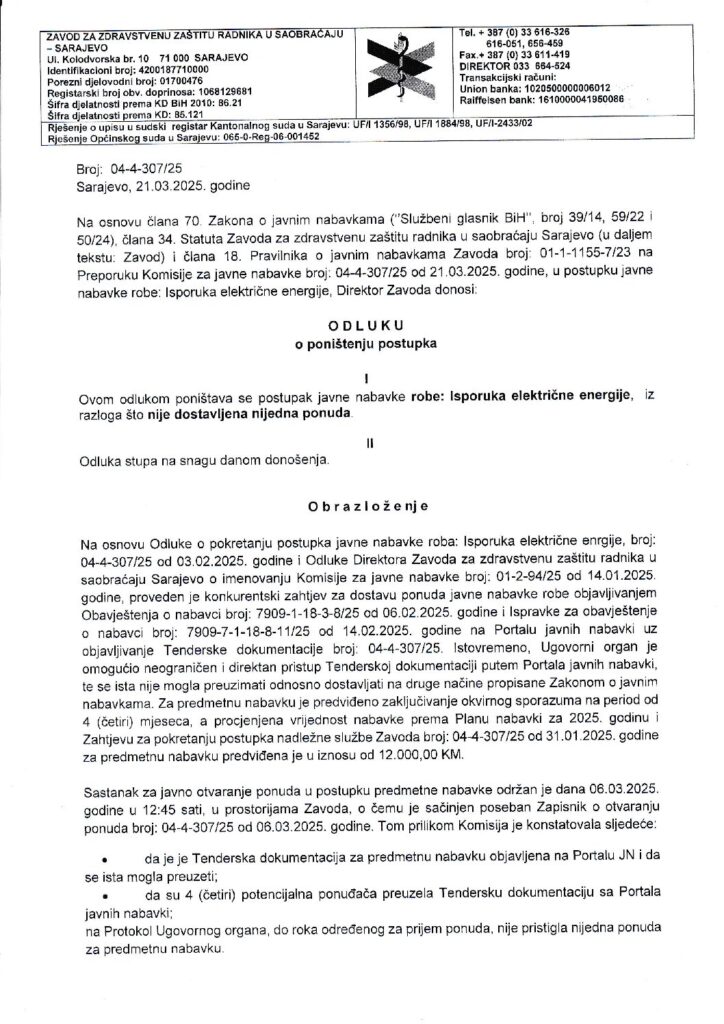 Odluka o poništenju postupka – isporuka električne energije