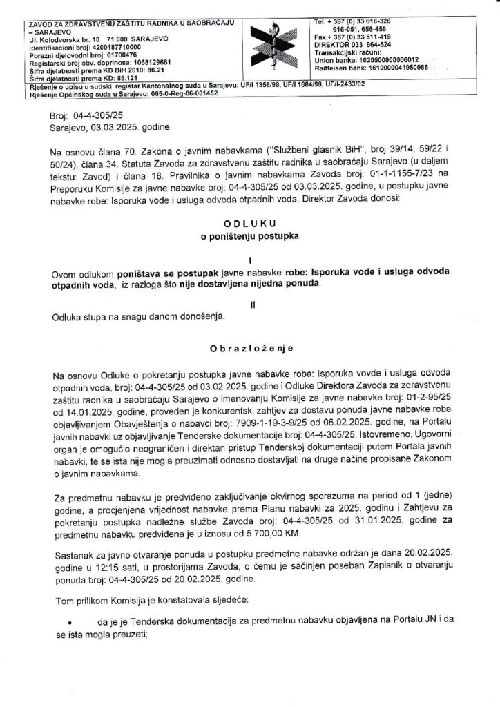 Odluka o poništenju postupka – isporuka vode i usluga odvoda otpadnih voda